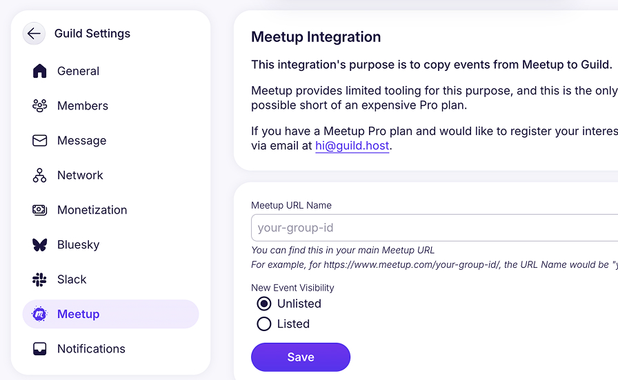 If you have a Meetup Pro plan and would like to register your interest in a tighter integration, let us know via email at hi@guild.host.