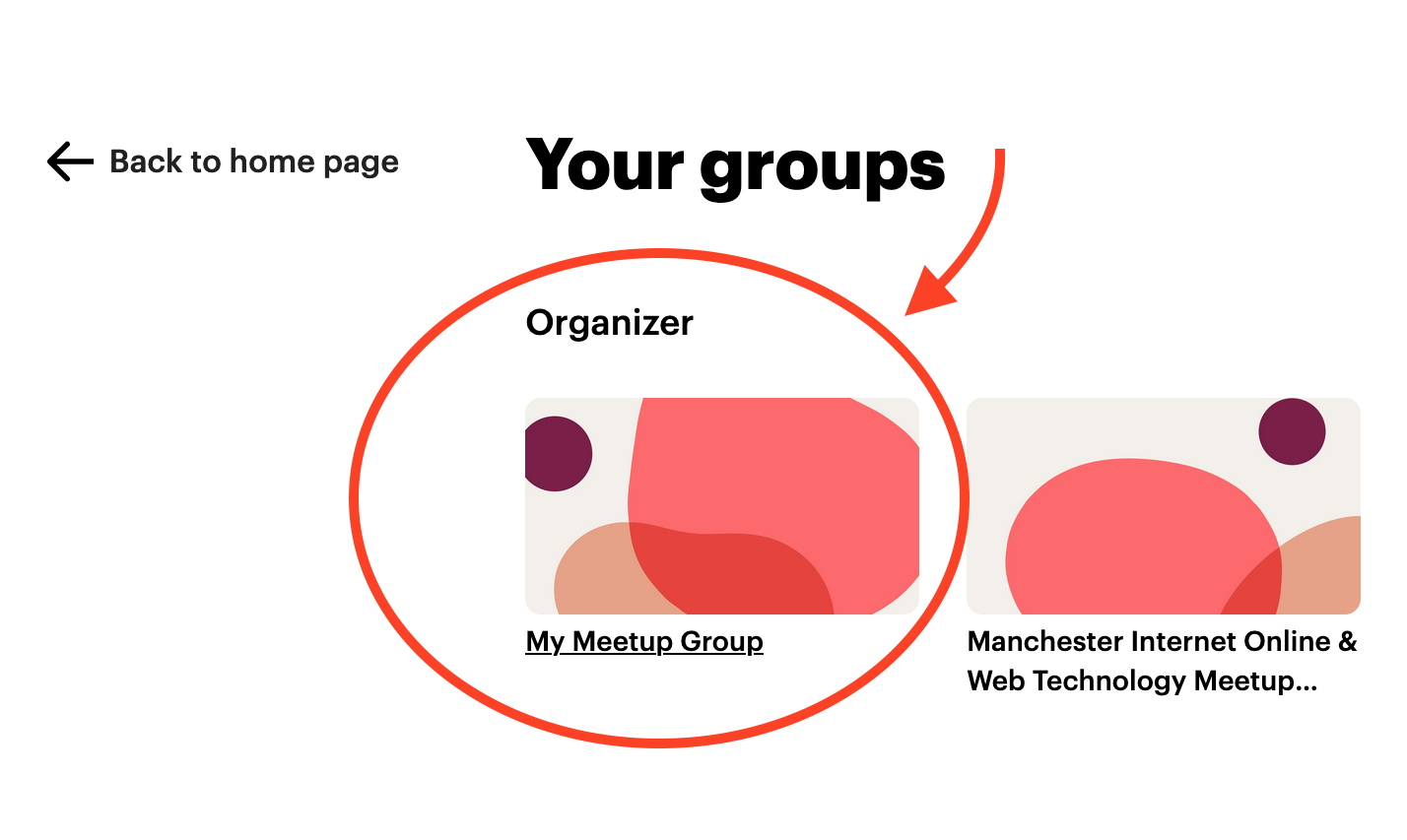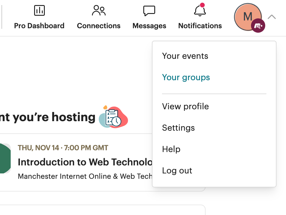 Sign in to Meetup, then go to Your groups by clicking on your profile picture (or initials) on the right hand side of the screen, a drop-down menu will appear, select Your groups.